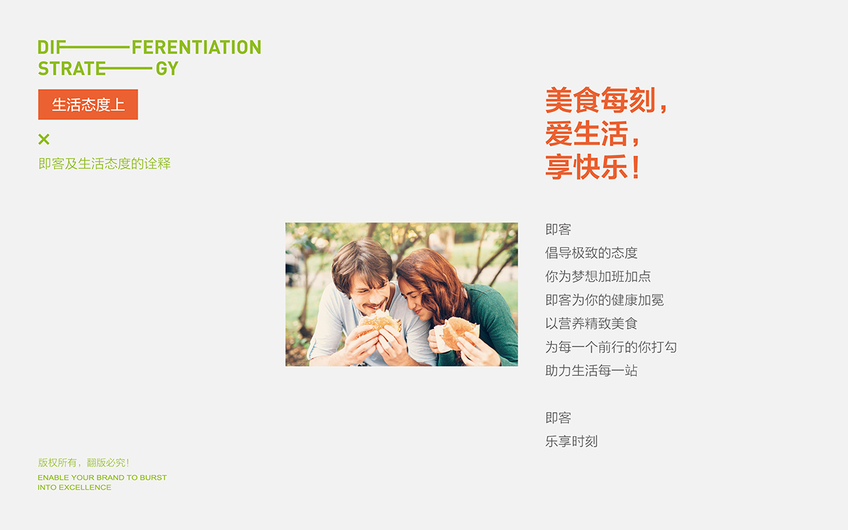 即客,樂享時刻。我們定義并通過視覺化表現(xiàn)來詮釋“樂享”主張。簡約、流動、張力的視覺符合結(jié)合品牌理念和產(chǎn)品賣點貫穿始終,塑造出一個年輕并賦予消費者健康快樂的品牌體驗。